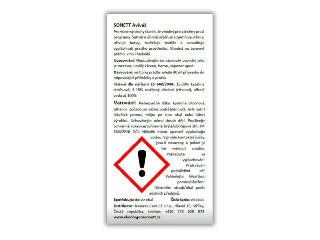 Odstraňte obsah/obal podle místních předpisů. Zvláštnosti produktu Použitá kyselina citronová je v potravinářské kvalitě a má výjimečnou biodegrabilitu. Prací prostředky jsou z drtivé většiny alkalické, použitím kyselé aviváže se praní neutralizuje, což je zvláště vhodné pro alergiky.
